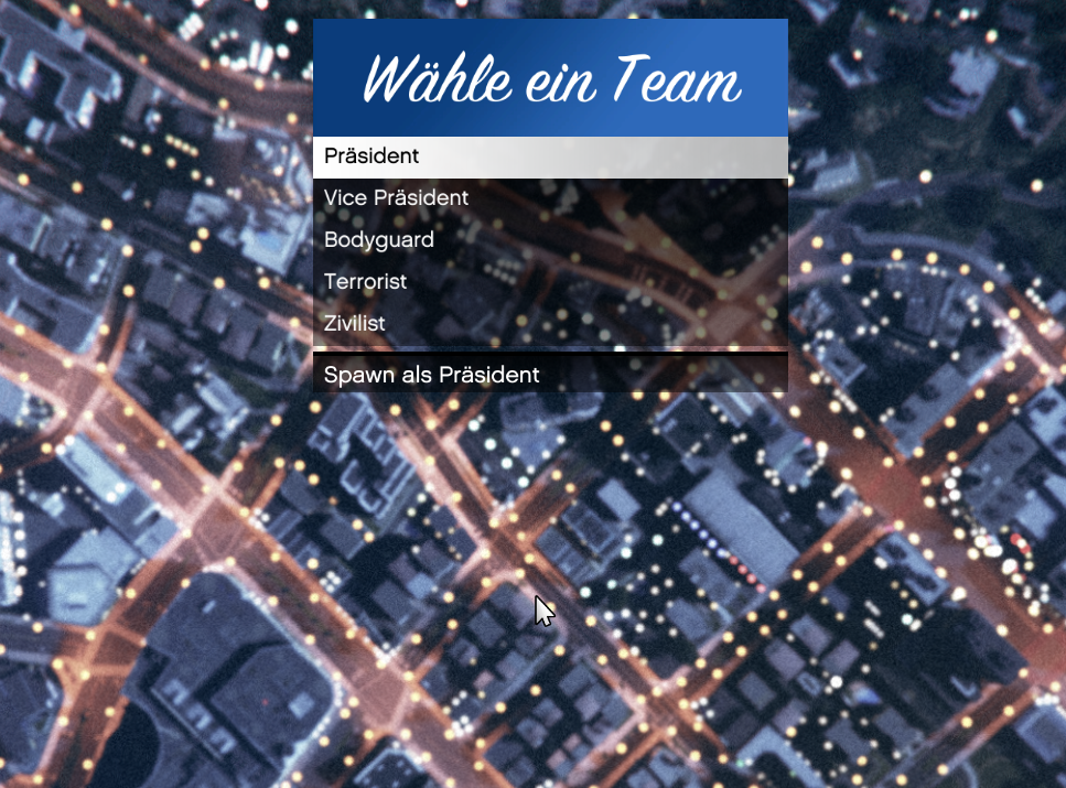 Falls du ein Team wechseln möchtest drückst du auf F6 und kommst in das Team-Auswahlmenü: (nicht zulässig für Präsident und Vizepräsident)