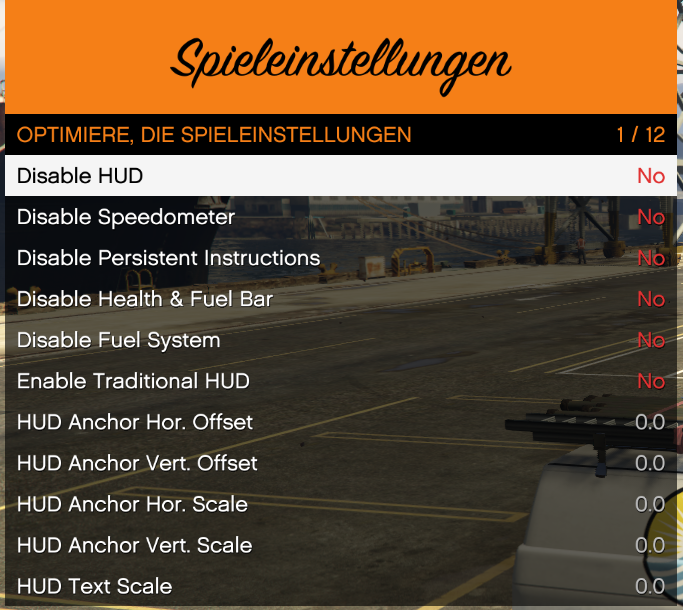 Im Einstellungsmenü, kannst du die Hud-s anpassen z. B. den Minimap-Anker (und alles, was dazu gehört). Außerdem kann z. B. das Kraftstoffsystem geändert werden usw