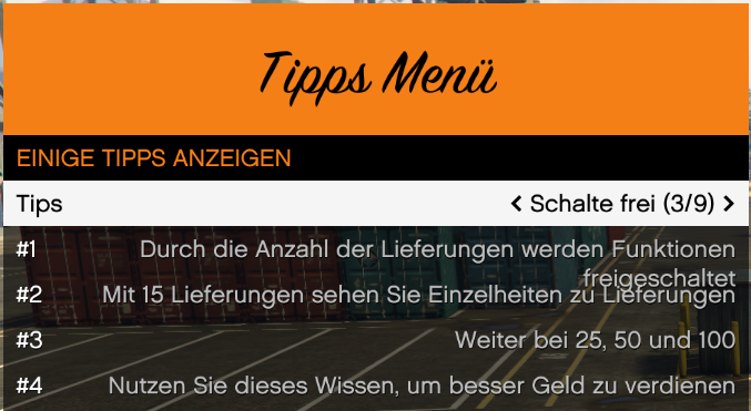 Bei Fortschritten geht es darum, deine Ausrüstung zu verbessern und neue Fahrzeuge zu kaufen. Je größer und besser das Fahrzeug ist, desto mehr werden Sie pro Job bezahlt. Abgeschlossene Lieferungen werden gezählt, und bei bestimmten Meilensteinen werden Ihnen weitere Informationen zu jedem verfügbaren Auftrag angezeigt, sodass du leichter bestimmen kannst, welche Aufträge du ausführen möchtest.