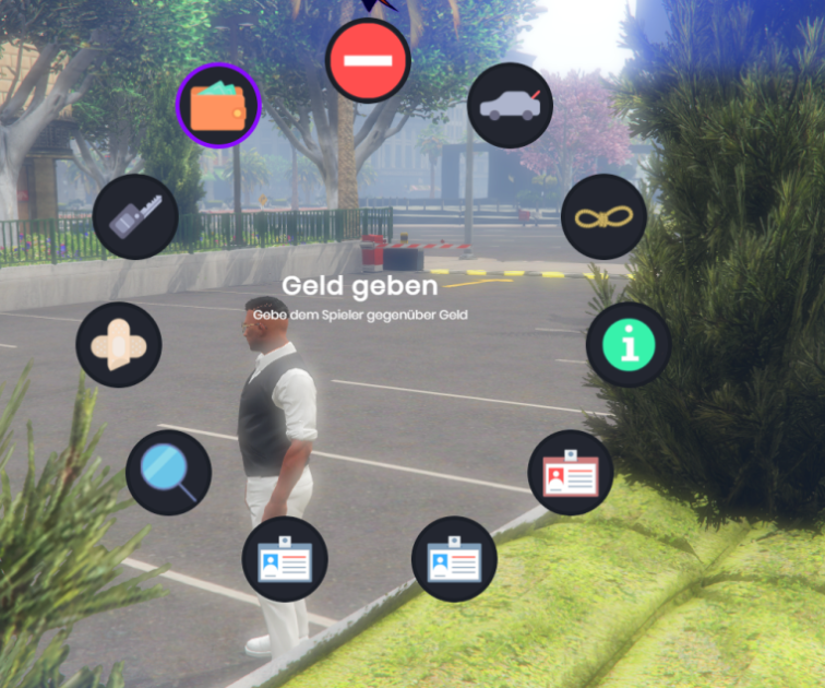 Mit diesem Spielermenü könnt Ihr Geld geben, fesseln, Kofferraumdurchsuchen, Motor/An/Aus , Spieler Untersuchen usw.