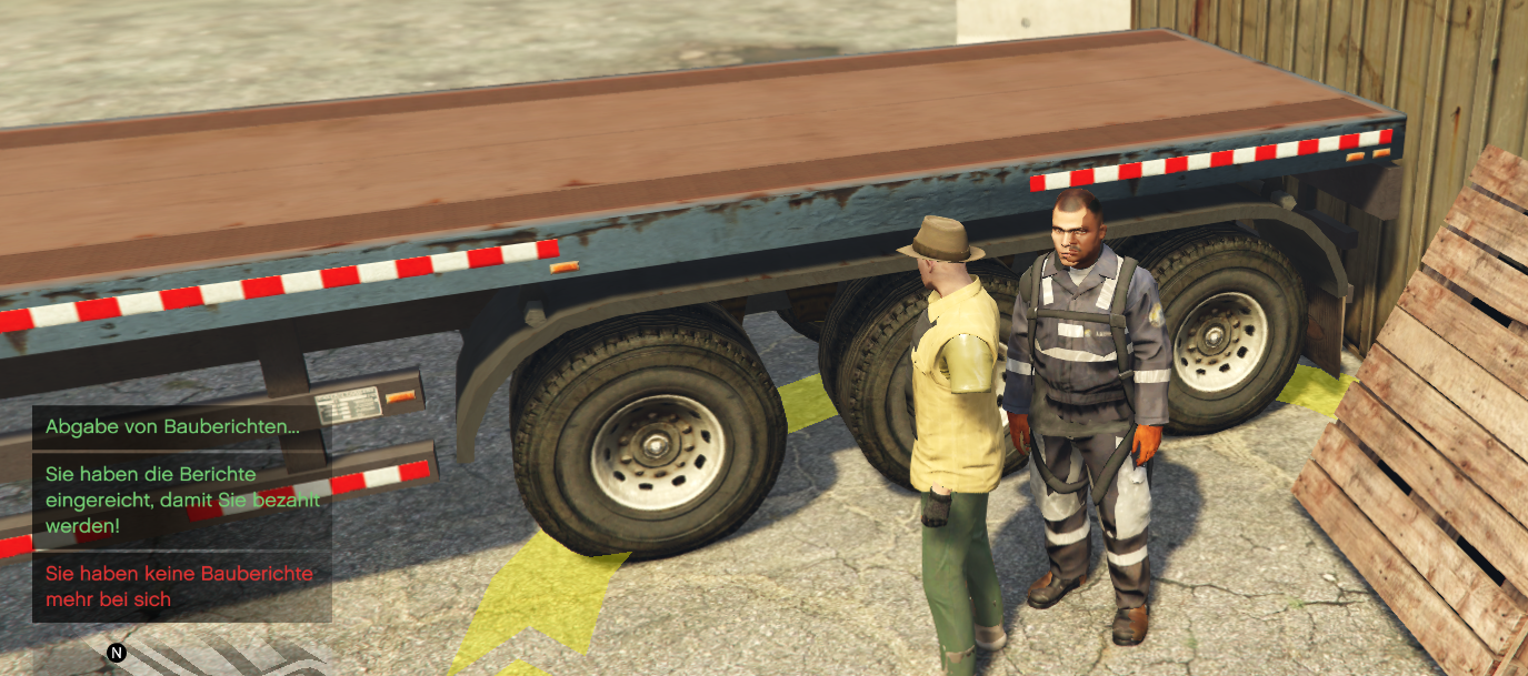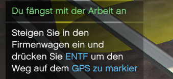 Ihr fährt zu Job nimmt euch die Kleidung, das Fahrzeug und fährt die Baustellen ab, dort drückt Ihr dann die Taste "E".