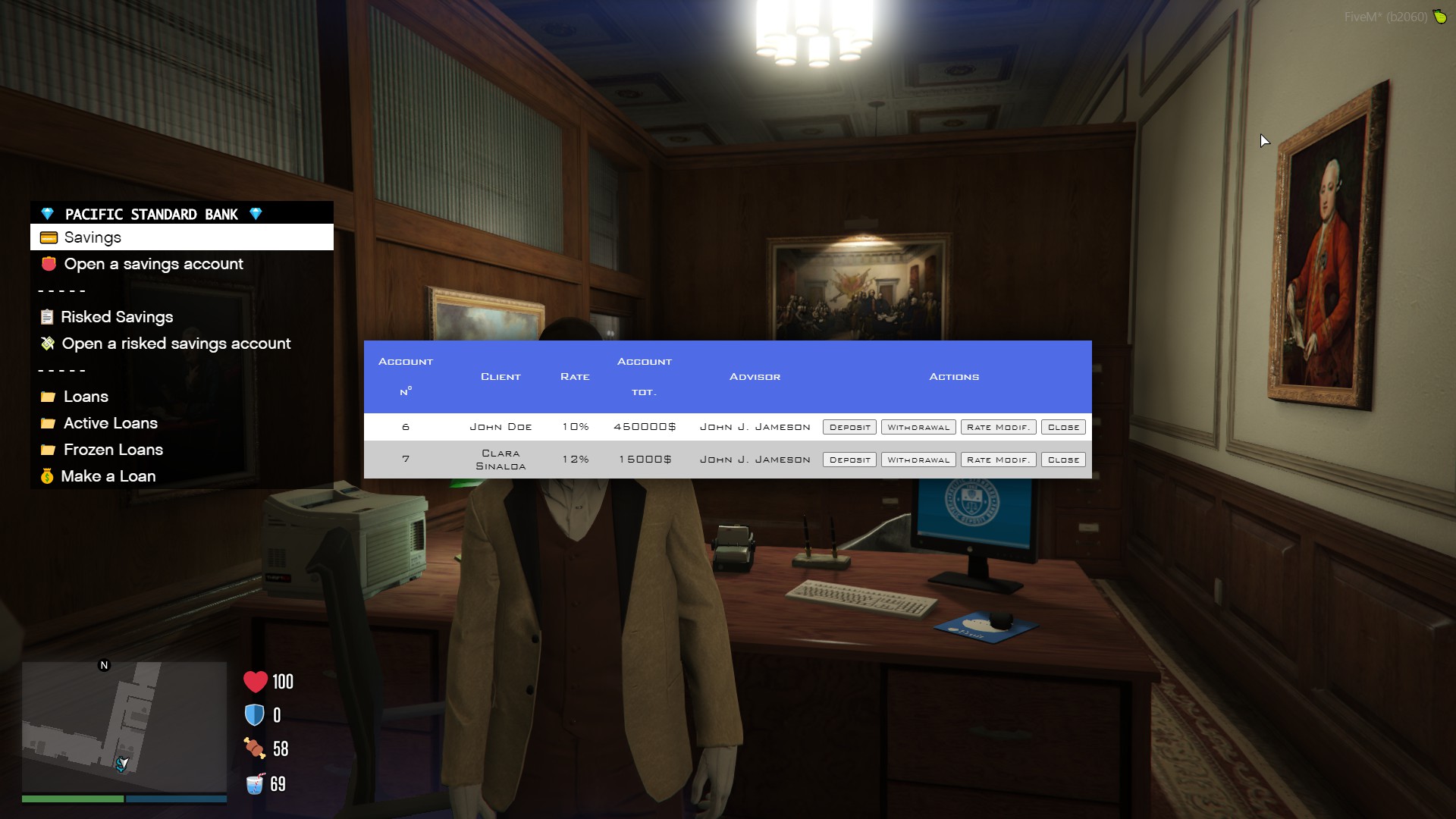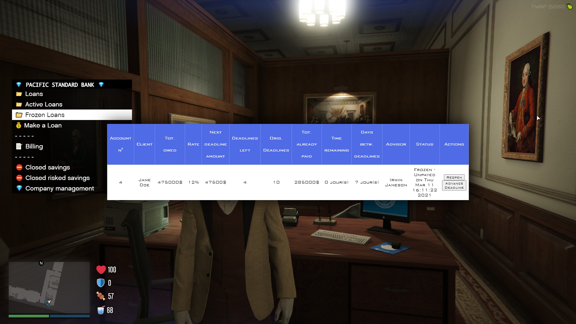 Der Job hat solche Funktionen wie Kredite, Geldsparen (mit benutzerdefinierten Raten) automatisierte Aufgaben, riskantes Sparen, Inventar, Firmenfahrzeuge usw.