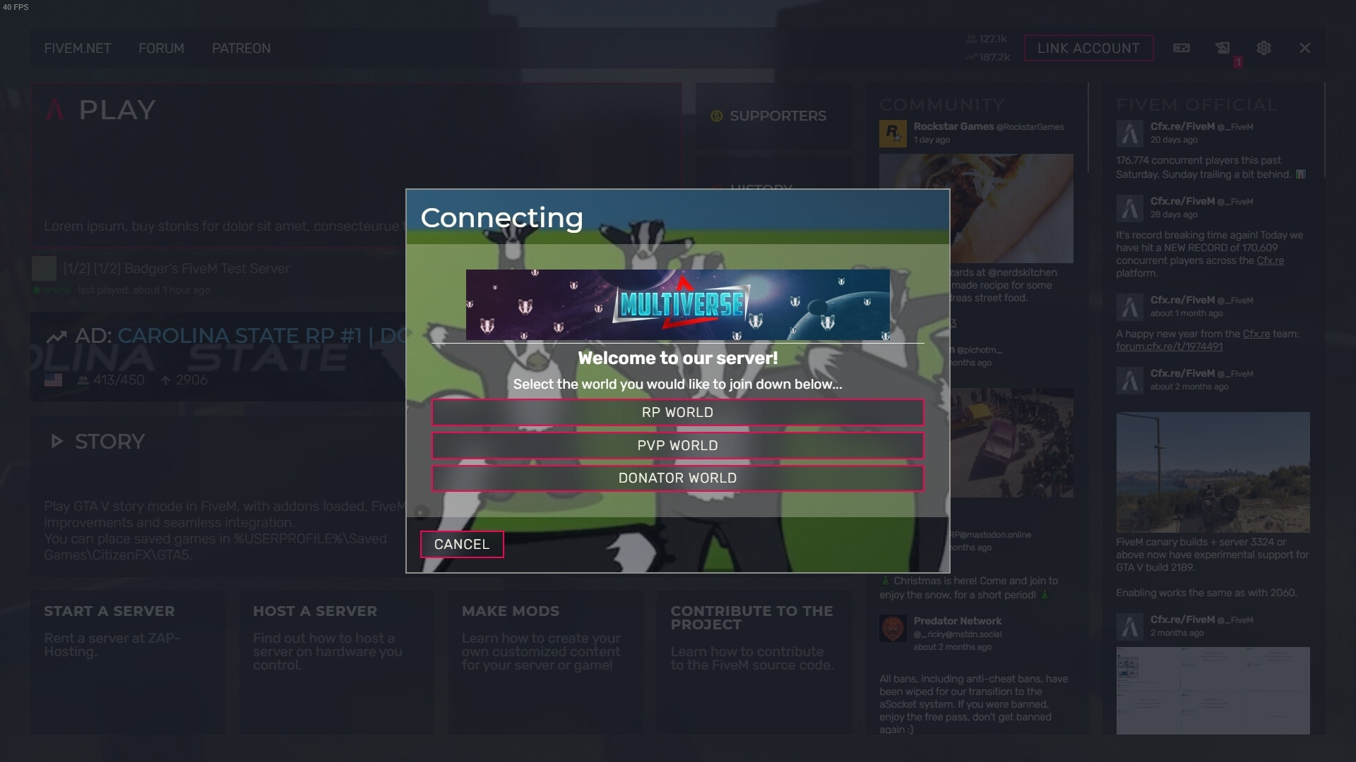 Multiverse-World-Manager ist eine Idee, die von einem sehr beliebten Minecraft-Plugin namens "Multiverse" übernommen wurde. Dieses Skript ermöglicht dir mehrere Welten auf deinem FiveM-Server zu haben. Es sind nicht wirklich verschiedene Welten, sondern verschiedene "Routing-Buckets". Spieler können je nach Berechtigung in verschiedene Welten wechseln und/oder im Ladebildschirm die Welt auswählen in den sie spielen wollen über "AdaptiveCards) .