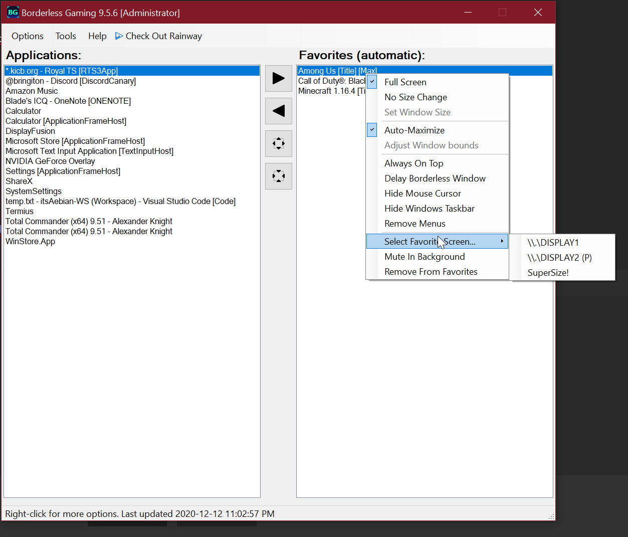 Danach die Anwendungen starten und als Favoriten markieren, dann wird "Borderless Gaming" dafuer aktiviert. Man kann dann noch per Rechtsklick weitere Einstellungen vornehmen: