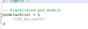 Zuerst öffnen wir die pedblacklist.lua, dort können wir auf die Blacklist Peds einfügen die in Cheat Programmen benutzt werden. (Kategorie Troll)