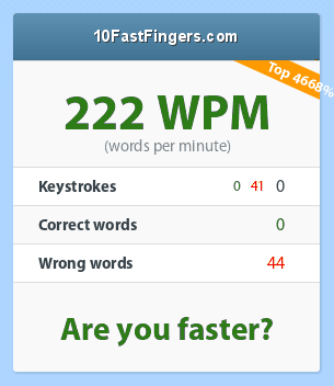 http://10fastfingers.com/speed…_0_0_33_2_32.64_5686_8441//edit habe mich verbessert http://10fastfingers.com/speed…_0_0_41_0_44.84_4668_8463